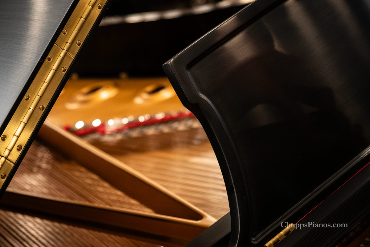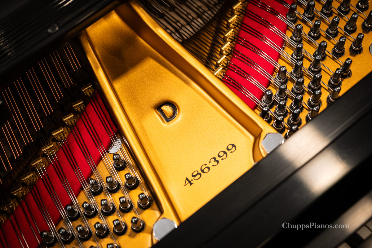 First introduced in 1884 and still in regular production at both the New York and Hamburg Factories, the Steinway & Sons Model D Concert Grand Piano is the instrument by which all other concert pianos are judged. The pinnacle of Steinway piano design, these instruments measure just under nine feet in length. Often featured on the stages of the leading premier concert venues in the world – they are just at home in the residences of many Steinway aficionados and advanced pianists. Steinway & Sons Model D #486399 was built in 1983 at the New York Steinway & Sons Factory has received a well-deserved full restoration by Chupp’s Piano Service, Inc. This stunning example of Steinway quality has returned to its deserved place as a concert-level, concert-ready Steinway grand and is ready for your examination in our piano restoration facility.The piano’s cabinet features square arms and tapered, spade legs. The cabinet was refinished in a satin ebony, hand rubbed lacquer. Solid brass hardware contrasts against the sleek black cabinet with the interior hardware re-plated in brilliant nickel. The backbone of the piano, the cast iron plate was rebronzed in a brilliant gold sheen. The piano’s action has been fully rebuilt with new Steinway hammers, and new shanks, flanges and wippens. Expertly voiced and regulated by our piano technicians, it is capable of supporting the repertoire of any concert pianist. The piano’s original soundboard was expertly restored and a new custom fitted hard maple pinblock was installed for optimum stability. The powerful scale design of the Model D is on full display and it is sure to fill the far corners of any concert hall! Below is a list of work completed during the restoration of this concert instrument.